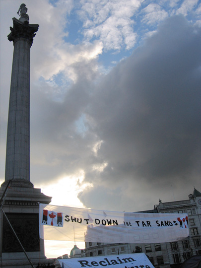 On Monday 14th of December, campaigners from the UK Tar Sands Network and Camp for Climate Action protested outside Canada House in London and shut down Pall Mall Street in Trafalgar Square to protest against Canada’s attempts to derail the climate change negotiations in Copenhagen.